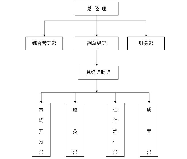 公司為了更好服務于船員和航運企業(yè)、相關合作單位等,廈門海盈海運特設立了總經理直轄管理的副總經理( 崗位)及綜合管理部、財務部等,同時設立總經理——副總經理——總經理助理順序垂直管理的四個職能 部門:市場開發(fā)部、船員部、證件培訓部、質管部,為船員服務管理業(yè)務和其他業(yè)務提供有力的人力資 源和對口崗位保障。組織機構圖如下: